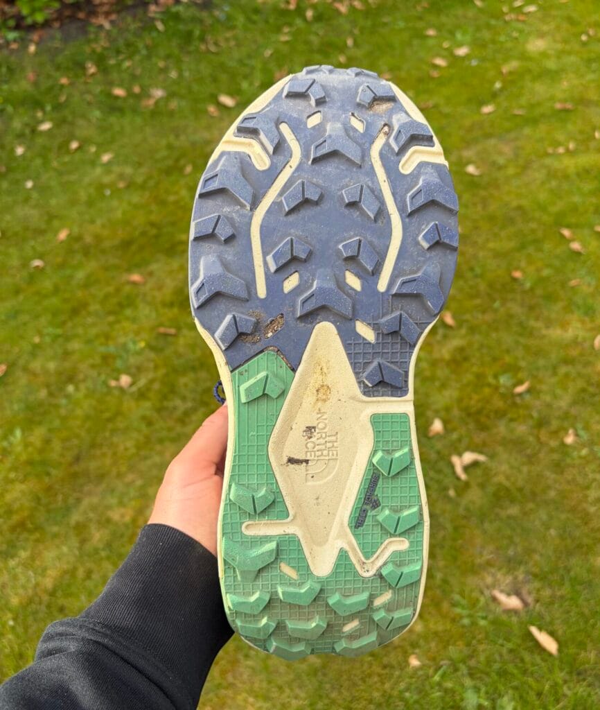 In mijn maat weegt de Altamesa v2 zo’n 280 gram. Niet super licht als je het vergelijkt met de carbon schoenen van vandaag de dag, maar voor een trailschoen wel aan de lichtere kant. Zeker als je bedenkt dat de schoen 40 millimeter hoog is in de hiel. De schoen heeft een verval/drop van 6 millimeter, dus is 34 hoog in de voorvoet. Zoals gezegd, gebruikt TNF een nieuw soort foam voor deze schoen, namelijk een TPU-foam, waardoor de demping erg prettig is en de energietergave ook goed is. Het laatste wat handig is om te weten is dat het profiel van het rubber onder de zool 4 millimeter hoog is. Wat mij betreft, meer dan voldoende voor de gemiddelde Nederlandse trail. Het is een keer geen Vibram-rubber ook, maar een eigen formule rubber van The North Face, en tot op heden kan ik er nog geen nadelen van ontdekken. Ik zie na 100 kilometer nog geen slijtage, en de tractie is goed.