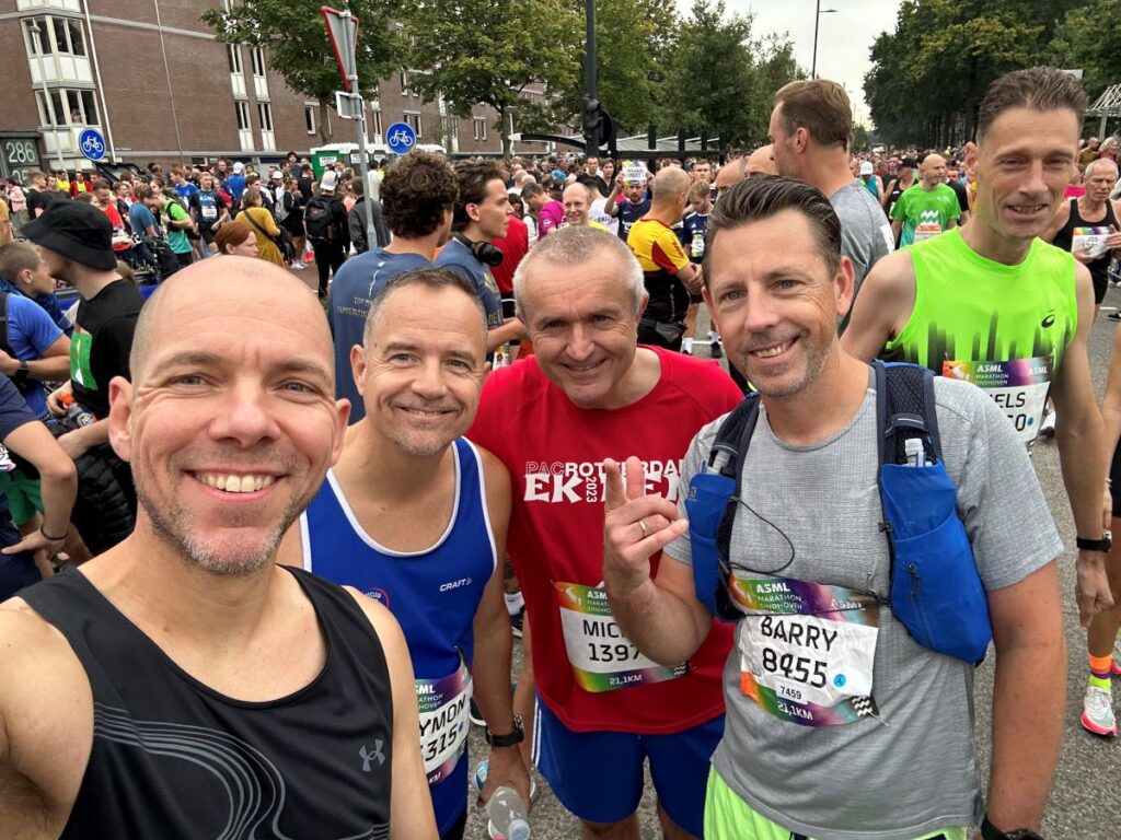 Aangekomen in Eindhoven, eerst maar eens opzoek naar mijn “loop maten”, zijn ze er allemaal klaar voor? Sommige zijn licht nerveus, ik zal niet verklappen wie, maar hij heeft in ieder geval genoeg drinken bij zich voor onderweg.